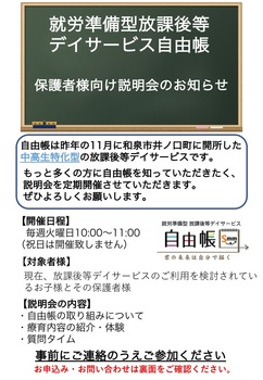 自由帳管理者で理学療法士の上野です。 今回は、自由帳のご利用を検討されているお子様の保護者様を対象にした説明会のお知らせです。 毎週火曜日10:00〜11:00のお時間をいただき、自由帳にて開催させていただきます。 詳細はチラシの画像をクリックしてご確認ください。 「自由帳気になっていたんだよね」と言う保護者の方ぜひお気軽に起こしください