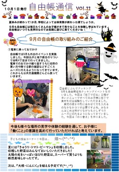 自由帳通信vol.11を発行しましたので紹介させてください。 今回は9月に実施した「電車でのおでかけ」「全部じぶんでクッキング」についてご報告させていただきます。 また、子どもの担当コーナーは、 自由帳の畑で収穫した野菜について、子ども達から報告していただいています! 画像をクリックで拡大出来ますので、ぜひご一読よろしくお願いいたします。 また、自由帳通信を毎月定期購読してくださる方大募集しております。 直接お持ちするか郵送でお送りさせていただきます。 ご希望の方はぜひご連絡ください!!