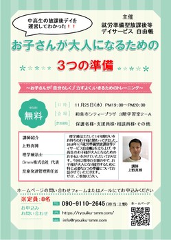 「就労準備型放課後等デイサービス自由帳」を運営して今月で2年たちました。約40名の中高生のお子様と関わってきた経験のなかでの気づき「障がいをお持ちのお子様が大人になる過程で特に必要な3つのポイント」を自由帳の取り組みを通じてお話出来ればと考えております。